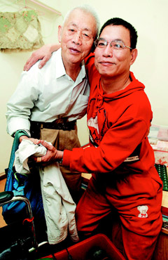 提著藍色布包,87歲的胡偉昨天早上搭著公交車來到中山女高校門口,加入善愿愛心協(xié)會志工的行列,這是他七年多來每周日例行活動,風(fēng)雨無阻。他是協(xié)會“國寶級”志工,因年歲大行動較為緩慢,昨天他一如往常與其它志工前往受助人家中,駝著背將捐出的1000元善款交到小他26歲的身障者蔡行展手里。