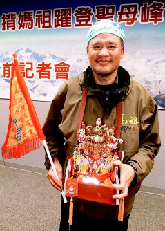 中新網(wǎng)3月17日電 據(jù)臺灣《聯(lián)合報》報道,臺灣登山好手李小石計劃背負(fù)馬祖天后宮媽祖金身攀登世界最高峰珠穆朗瑪峰,16日出發(fā),連江縣長與上百鄉(xiāng)親到桃園機(jī)場送媽祖啟程,為李小石加油打氣。