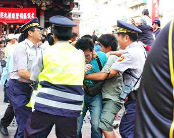 《自由時(shí)報(bào)》描述稱,學(xué)生嗆聲時(shí),穿著武廟工作人員背心的多名男子突然沖上前,將學(xué)生往外推擠,還有人趁機(jī)出手毆打?qū)W生。警方見(jiàn)狀則搶下抗議標(biāo)語(yǔ),為避免媒體拍到標(biāo)語(yǔ),還蓋住標(biāo)語(yǔ),“以跑百米的速度”直奔派出所,并將學(xué)生帶往派出所,馬英九則在安全人員及人群的簇?fù)硐驴焖龠M(jìn)入武廟揭牌。