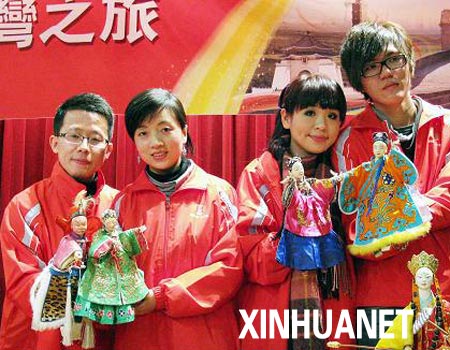 1月14日,兩岸新人在體驗(yàn)臺(tái)灣布袋戲時(shí)合影留念。來(lái)自大陸的26對(duì)新人搭乘兩岸直航班機(jī)來(lái)到臺(tái)灣,將參加于1月15日在日月潭舉行的“日月同喜,喜傳天下”集體婚禮并游覽臺(tái)灣名勝古跡,感受當(dāng)?shù)仫L(fēng)土人情。新華社圖