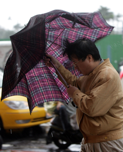 米塔臺風(fēng)二十六日下午已轉(zhuǎn)為輕度臺風(fēng),臺灣氣象部門預(yù)測米塔臺風(fēng)暴風(fēng)圈將會縮小,但外圍環(huán)流與鋒面共伴效應(yīng)為臺灣島北部及東部帶來的豪雨仍會持續(xù)。圖為行人在雨中艱難行進(jìn)!爸醒肷纭眻D 張皓安 攝