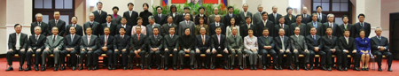 臺灣當(dāng)局“行政院”二十四日下午加開臨時“院會”,通過總辭案!靶姓洪L”張俊雄和全體成員拍“畢業(yè)照”留念。面對媒體關(guān)切和詢問,他不愿發(fā)表意見!爸醒肷纭眻D 蘇圣斌 攝