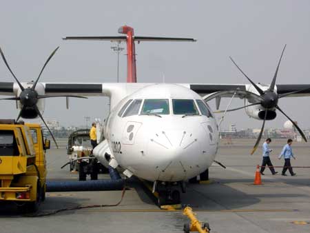 油價居高不下加上高鐵沖擊,令臺灣航空業(yè)者的“寒冬”雪上加霜,部分航空公司改以雙螺旋槳飛機飛航島內(nèi)航線!爸醒肷纭眻D 程啟峰 攝