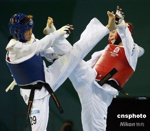 8月21日,北京奧運(yùn)跆拳道女子57公斤級(jí)比賽在北京科技大學(xué)體育館舉行,在銅牌爭奪賽中,中華臺(tái)北隊(duì)蘇麗文(藍(lán)方)不敵克羅地亞選手。中新社發(fā) CNAsports 攝