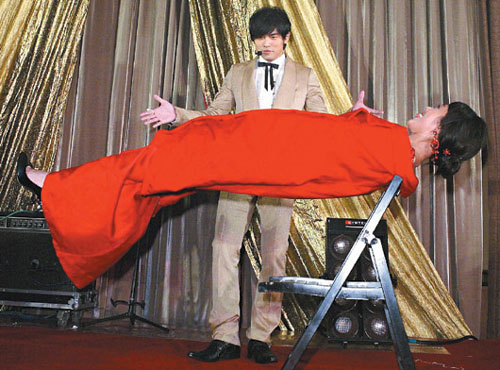 “南拳媽媽”團(tuán)長(zhǎng)彈頭,昨天迎娶交往半年的女友洪端偋,晚間舉辦盛大豪華婚宴,介紹兩人認(rèn)識(shí)的周杰倫,婚禮上花心思帶來(lái)一段“超級(jí)魔術(shù)秀”,神奇地把新娘子漂浮空中。(臺(tái)灣《聯(lián)合報(bào)》圖)