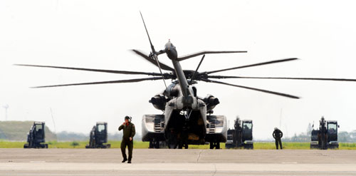 17日下午,美國一架編號546的MH-53E海龍掃雷直升機(非官方所指的CH-53E超級種馬運兵直升機),先從停泊臺灣外海的“丹佛號”兩棲登陸補給艦(LPD-9)上飛抵臺南空軍基地。完成航線規(guī)劃協(xié)調后,海龍直升機今天上午將連同另三架美軍直升機先進行地面探勘試飛后,再返回分趟吊掛小山貓進入災區(qū)協(xié)助救災。