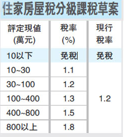 根據(jù)“財(cái)政部”所擬草案,房屋評定現(xiàn)值在10萬元以下者,仍維持免稅;超過10萬元以上的住家用房屋,房屋稅將分為五級課稅,稅率分別是1.1%、1.2%、1.3%、1.5%及1.8%。
