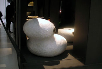 王俊隆還費(fèi)時(shí)2年半研究“作繭計(jì)劃”制成“蠶繭沙發(fā)”,王俊隆就此作品表示,記起小時(shí)候?匆(jiàn)有人斗笠破了,就在夜間放蠶寶寶在斗笠破處,隔天蠶寶寶便會(huì)吐絲把斗笠破洞修補(bǔ)好,因此他不斷實(shí)驗(yàn),讓5000只蠶寶寶在竹編沙發(fā)上吐絲,把沙發(fā)的2個(gè)橢圓型,包覆成2個(gè)巨大的蠶蛹。