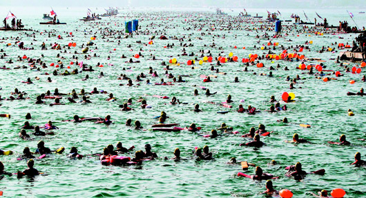 主持鳴槍下水的臺(tái)當(dāng)局“行政院長(zhǎng)”吳敦義說(shuō),比起他二十七年前舉辦首屆泳渡的規(guī)模,足足增加五十倍。南投縣長(zhǎng)李朝卿說(shuō),二五八八八名泳者諧音“要我發(fā)發(fā)發(fā)”,所有參加的“勇者”都發(fā)發(fā)發(fā)。