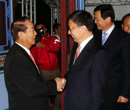 中新網(wǎng)4月9日電 據(jù)“中央社”報道,臺北縣長周錫瑋和親民黨主席8日在板橋林家花園和上海市長韓正等人會面,宋楚瑜說,大家要共同為兩岸和平努力,不要兵戎相見,把和平帶給子子孫孫。