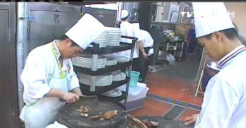 廚房里,43名大陸沙縣廚師忙里忙外,要籌備17道家鄉(xiāng)特色小吃,可不容易。豆腐、蛋白、再加點地瓜粉,充分?jǐn)嚢韬螅由弦稽c鮮肉,放進(jìn)熱水中,這是沙縣特色的豆腐丸子。