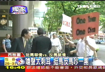 而飯店里的挺馬僑胞也不停在喊支持口號(hào),才讓馬英九開(kāi)心地笑了,挺馬僑胞的歡呼聲一時(shí)間蓋過(guò)了場(chǎng)外的嗆聲。而反馬僑胞仍舊拼命表演,手上高舉“ONE TAIWAN ONE CHINA”的“臺(tái)獨(dú)”標(biāo)語(yǔ),徹底惹毛了飯店2樓的挺馬僑胞,忍不住沖下了樓,戰(zhàn)火一觸即發(fā)。