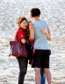 接獲惡耗的家屬相繼趕到后湖海灘,有人癱倒在親人懷抱中,不?藓皭圩拥拿,要他們趕快回來,有的則手持念珠面向大海,盼望出現(xiàn)奇跡,天下父母心的焦灼憂慮,讓蜂擁關(guān)切的民眾看了也心酸。