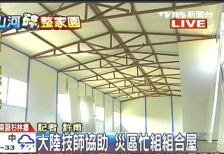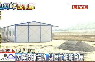 至于杉林鄉(xiāng)的內(nèi)部隔間尚未動工,需大陸的技術(shù)人員協(xié)助,而今天中午還會有7名大陸的技術(shù)人員抵臺指導(dǎo)、協(xié)助,預(yù)計(jì)下午4點(diǎn),第3批組合屋約300多戶也會運(yùn)來臺灣,將分為四批規(guī)劃搭建。