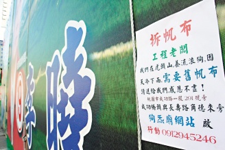 桃園市區(qū)大型選舉廣告牌下端,連日被貼了索取告示:“拆帆布老板,我們?cè)诨㈩^山飼養(yǎng)流浪犬,因?yàn)樘鞖夂,如果舊帆布不再需要,請(qǐng)送給我們,感恩不盡……”