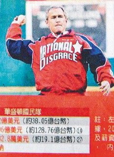 中新網(wǎng)3月19日電 據(jù)臺灣《聯(lián)合報(bào)》報(bào)道,臺媒體《自由時(shí)報(bào)》18日刊登2005年當(dāng)時(shí)美國總統(tǒng)布什開球的照片,但沒想到搞了“大烏龍”,把球迷合成的照片當(dāng)成正版,布什穿上寫著英文“國恥”的球衣,好不尷尬。