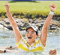 中新網(wǎng)4月6日電 據(jù)臺(tái)灣媒體報(bào)道,臺(tái)灣高球天后曾雅妮5日在LPGA(Ladies Professional Golf Association,女子職業(yè)高爾夫巡回賽)四大賽之一、納比斯科錦標(biāo)賽中擊敗世界前10名高手,奪下后冠,獲得30萬(wàn)美元獎(jiǎng)金,也是賽史上第1位摘冠的華人球員。曾雅妮奪冠后激動(dòng)得舉起雙手,興高采烈地依照傳統(tǒng)躍進(jìn)水池中慶祝。