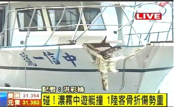 中新網(wǎng)4月15日電 據(jù)臺(tái)灣TVBS報(bào)道,南投日月潭15日上午起大霧,2艘載有大陸游客的游艇在霧中相撞,來(lái)自大連的旅行團(tuán)中有4人受傷,另外還有2名臺(tái)灣人受傷,其中有1人摔倒骨折,傷勢(shì)較嚴(yán)重。