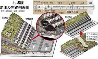 臺“國工局”規(guī)劃組人員26日調(diào)出1993年的設計規(guī)劃資料,帶著設計圖到現(xiàn)場比對,發(fā)現(xiàn)災變段地質(zhì)狀況與設計之初無異,地層滑動方向也是順向坡,但下方巖錨抓力擋不住山頭高點的山崩,初步判斷極可能是山崩規(guī)模和范圍超出當時巖錨防護設計。