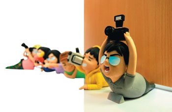 她設(shè)計6種不同的狗仔隊造型,包括攝影記者高舉雙手拿著相機、女記者拿著麥克風(fēng)往前擠、攝影記者扛著攝影機側(cè)身拍照等。陳郁青表示,通常門縫都有一點小空隙,加上狗仔隊門擋后,好像狗仔隊從門縫中爬出,她自己也覺得很有趣。