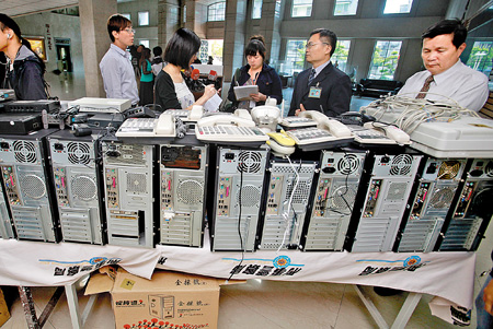 臺(tái)灣“刑事局”偵一隊(duì)、臺(tái)北縣市刑偵大隊(duì)昨天兵分十五路查緝,直搗集團(tuán)核心機(jī)房,查扣四十九臺(tái)電腦、電話機(jī)九十具、手機(jī)六十七支及現(xiàn)金十一萬(wàn),逮捕主嫌陳光著等32人。
