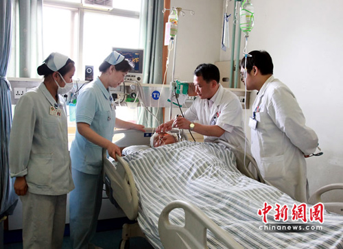 中新網(wǎng)長沙5月6日電(劉柱 伍西明)“多虧醫(yī)院救了我丈夫的命,歡迎你們來臺灣做客!”在湖南湘雅醫(yī)院重癥醫(yī)學科(ICU病房),剛剛從臺灣趕來長沙的臺胞患者梁登輝的夫人對病房里的醫(yī)生和護士們連聲感謝。