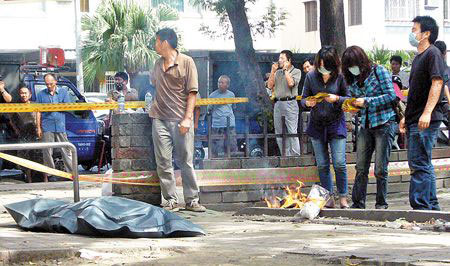 中新網(wǎng)6月10日電 據(jù)臺灣《中國時報》報道,臺灣高雄縣市交界的崗山仔地區(qū)9日中午連續(xù)傳出槍響,水果攤商翁文定為攤位糾紛,持槍在市場朝同行黃春生近距離開槍,隨后騎車往崗山仔公園,打手機(jī)給女性友人告知“我要自殺了”,就朝太陽穴開槍當(dāng)場斃命,黃姓男子則身中四槍被送往醫(yī)院急救,性命垂危。