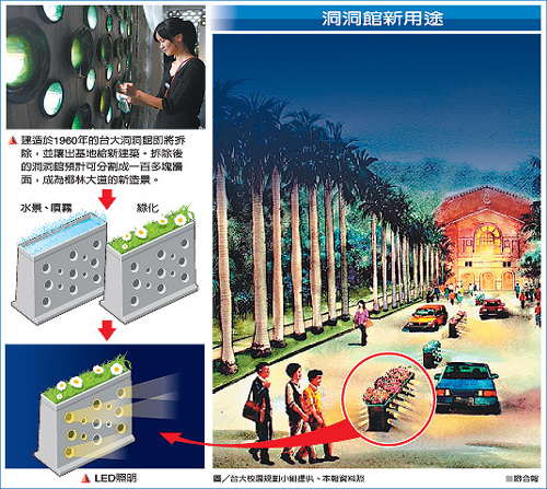 臺大校園規(guī)劃小組召集人劉聰桂昨天指出,為推動“改善椰林大道計劃”,決定將洞洞館墻重新利用,制成移動式LED分隔島,提供椰林大道交通分道、綠化及照明等功能,“讓‘洞洞館’再生”。