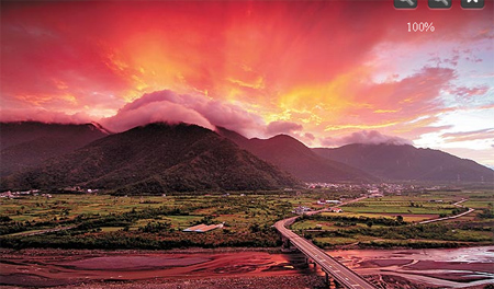 宜蘭南澳小學(xué)老師蔡沛旻昨清晨5時(shí)許,拍到南澳山區(qū)滿山火云,染成血紅的山頭向蒼穹激射出萬道紅光,仿佛火山爆發(fā)漫山熊熊烈火、又似盤古開天的氣勢,加上云彩翻山越嶺,氣勢壯麗磅礡,美妙的天象只維持5分鐘,已讓人驚嘆不已。