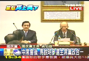 馬英九曾于2005年首次當選國民黨主席,2007年2月13日,因在臺北市長任內(nèi)“特別費”的使用,而被臺灣“高等法院檢察署”起訴(后經(jīng)臺灣法院宣判無罪),他曾承諾若遭起訴即辭去國民黨主席職務(wù),乃于同日請辭黨主席并正式宣布參選2008年“大選”。