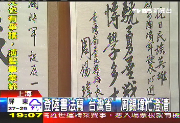 據(jù)臺媒報道,在上海的書畫展中,臺北縣長周錫瑋送去的書法,上面落款寫的是“臺灣省臺北縣長周錫瑋”,“臺灣省”三個字引發(fā)島內討論。
