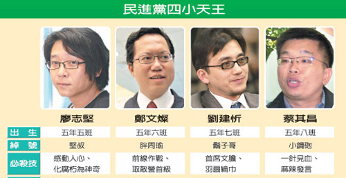 中新網(wǎng)12月14日電 在臺灣縣市長選戰(zhàn)結(jié)束后,深受民進黨主席蔡英文倚重的“五年級F4”戰(zhàn)斗團隊成形,民進黨桃園縣長參選人鄭文燦、發(fā)言人蔡其昌、政策會首席副執(zhí)行長劉建忻、文宣部副主任廖志堅,儼然成為民進黨的“四小天王”。