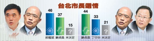 中新網(wǎng)3月4日電 據(jù)臺(tái)灣《聯(lián)合報(bào)》報(bào)道,臺(tái)當(dāng)局前“行政院長(zhǎng)”蘇貞昌表態(tài)投入臺(tái)北市長(zhǎng)選戰(zhàn),調(diào)查發(fā)現(xiàn),未來國民黨若由現(xiàn)任市長(zhǎng)郝龍斌迎戰(zhàn)蘇貞昌,郝龍斌目前以四成六支持率領(lǐng)先,蘇貞昌獲得三成七市民支持,一成五未決定。