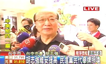 胡志強(qiáng)日前曾遭到一名大學(xué)生亮刀嗆聲,維安問題再度被關(guān)注。臺中市警局?jǐn)M提高維安規(guī)格,比照“直轄市長”,胡志強(qiáng)表示尊重專業(yè),絕對配合警方。