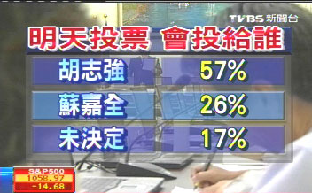 報(bào)道稱(chēng),誰(shuí)才是大臺(tái)中市民心中理想的第一屆市長(zhǎng)?TVBS民調(diào)中心,在5月25日晚間做出的最新民調(diào)顯示,假如明天就是投票日,將有57%的大臺(tái)中市民投票給國(guó)民黨籍的胡志強(qiáng),26%投給民進(jìn)黨籍的蘇嘉全,差距有31個(gè)百分點(diǎn),尚未決定的比例則有17%。