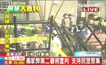 中新網(wǎng)6月11日電 據(jù)臺灣TVBS報(bào)道,陳水扁家族涉及的公務(wù)機(jī)要費(fèi)、南港展覽館、龍?zhí)顿彽丶跋村X案等案,臺灣高等法院于11日上午二審宣判;高等法院場外聚集了一堆挺扁、反扁民眾等候判決結(jié)果,警方派出大批警力,進(jìn)行周邊出入管制,嚴(yán)防沖突發(fā)生。