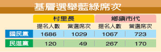 中新網6月13日電 據臺灣《聯(lián)合報》報道,臺灣17縣市基層選舉結果12日晚揭曉,國民黨(含以無黨籍參選的黨員)拿下1988席村里長、1187席鄉(xiāng)鎮(zhèn)市民代表,各約占總席次半數,輔選系統(tǒng)評估,藍軍總當選席次明顯高于綠營,藍綠基層版圖變動不大。