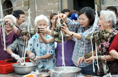 一邊品嘗著粽子,蔡英文表示,雖然第一次到貢寮龍門村,但開車常經(jīng)過,而小時候父親每年夏天都會招待員工到福隆海水浴場游泳,她對這里感覺很親切,并承諾若當選新北市長,明年端午節(jié)還要來龍門包粽子。