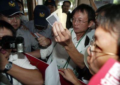 中新網(wǎng)10月26日電 臺(tái)灣的綠黨、第三社會(huì)黨及民間團(tuán)體,今天上午在“立法院”演出行動(dòng)劇,抗議“選罷法”修正案扼殺小黨生存空間。