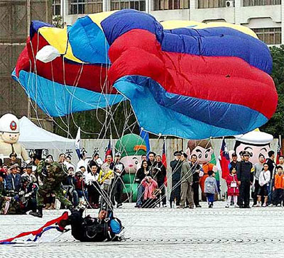據(jù)臺灣《聯(lián)合晚報》報道,10名“神龍小組”隊員由高空飄降至中正紀念堂廣場,組長王勸閩中校著陸時在地上翻滾,起身后發(fā)現(xiàn)流鼻血,軍方宣稱是高空氣壓變化造成,不是受傷。