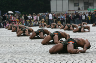 在高空跳傘表演之后,臺軍陸戰(zhàn)隊兩棲偵搜大隊赤裸上身表演蛙人操。隨后“陸軍步兵學校”體干班表演刺槍術(shù),演出團體刺、沖鋒對刺、刺槍擊破等項目。不過,當天使用的是練習用木槍,并非配上刺刀的真槍。
