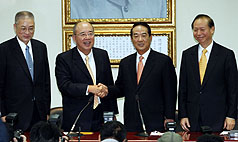 據(jù)“中央社”報(bào)道,宋楚瑜上午在秘書長秦金生等人陪同下前往國民黨中央拜會(huì)吳伯雄,兩人晤談后共同召開記者會(huì)。吳伯雄表示,國親必須奮發(fā)來救臺(tái)灣,為臺(tái)灣兩千三百萬人民留一點(diǎn)生計(jì),這是國親共同的愿望。