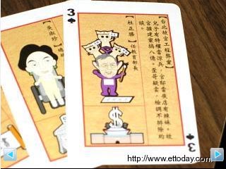 除了陳水扁以外,“紅心Q”上的陳水扁之妻吳淑珍拿著發(fā)票,旁邊寫“忙搜集股票、禮卷與發(fā)票。貪污被起訴。金孫穿戴英國名牌、吃高檔料理、都報公帳”;另外民進(jìn)黨2008參選人謝長廷,則在“方塊A”出現(xiàn),牌面寫著“立委謝長廷、跪拜宋七力、宇宙光明禮、一本賣兩萬”。