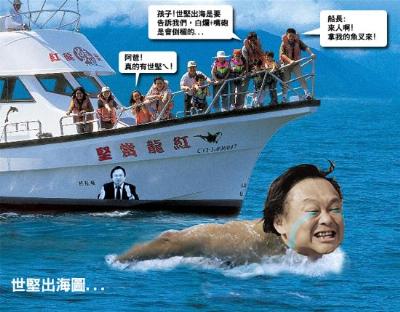 據(jù)臺灣東森新聞報(bào)道,王世堅(jiān)夸下?冢灰傲⑽边x戰(zhàn)臺北市國民黨八仙過海,拿到所有席次他會跳海。如今為了這個承諾,媒體緊迫盯人,生怕一不小心漏掉這則跳海新聞,最新版本則傳出他將在臺北縣萬里碼鋉漁港跳海,雖然未獲證實(shí),但相關(guān)單位都派駐大批人力,前往漁港附近待命以防意外發(fā)生。