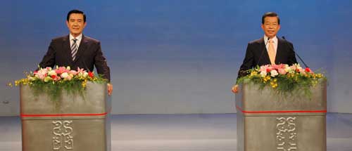 中新網(wǎng)3月8日電 據(jù)臺(tái)灣《中國(guó)時(shí)報(bào)》報(bào)道,馬英九、謝長(zhǎng)廷昨晚在第二場(chǎng)政見發(fā)表會(huì)上炮火猛烈、火力四射,互批對(duì)方使出“奧步”(賤招),不斷攻擊對(duì)手家人。兩人還不約而同為太太抱屈,馬英九不滿周美青被封為“股神”,且呼吁謝應(yīng)有領(lǐng)導(dǎo)人的高度;謝長(zhǎng)廷則怒斥對(duì)手將游芳枝取名“布袋枝”。