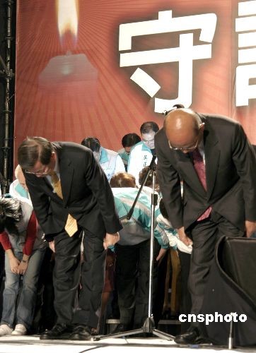 中新網(wǎng)3月22日電 據(jù)臺灣東森新聞報道,民進(jìn)黨輸?shù)?008年“大選”,謝蘇配大敗,得票與對手馬蕭相差超過220萬票,謝長廷7點半上臺,向支持者致歉和致謝。