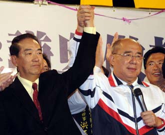 中新網(wǎng)3月23日電 馬蕭配當(dāng)選,國民黨繼“立委”選舉后再度大勝,國民黨主席吳伯雄感謝親民黨的協(xié)助,并向支持者表示,不久之后國親兩黨可能會宣布合并。宋楚瑜則向吳伯雄致最高敬意,他說,“國親本來就是一家人”。