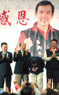 據(jù)臺灣《聯(lián)合報》報道,馬英九26日到臺中縣市、苗栗、桃園等地謝票,民眾搶著和他握手,捉住機會就和“馬總統(tǒng)”合照。馬蕭在北、中臺灣大贏對手,馬英九夸支持者“很厲害”、“贏得太過分了!”向民眾鞠躬十秒鐘。