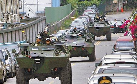 在裝甲車護(hù)送下,陳水扁及“部會(huì)首長(zhǎng)”進(jìn)行指揮所轉(zhuǎn)移演練,過程逼真。