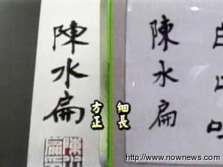 但除了這一般常見的簽名模式外,阿扁也曾經(jīng)用毛筆簽過名,在嘉義著名砂鍋魚頭店里阿扁的簽名,同樣是毛筆字簽名,還有這一幅送給黨內(nèi)公職人員相片的落款,仔細(xì)比較一下,兩種字體完全不同,送給餐廳字體比較細(xì)長,餐廳老板說,當(dāng)時陳水扁可是寫的很緊張。
